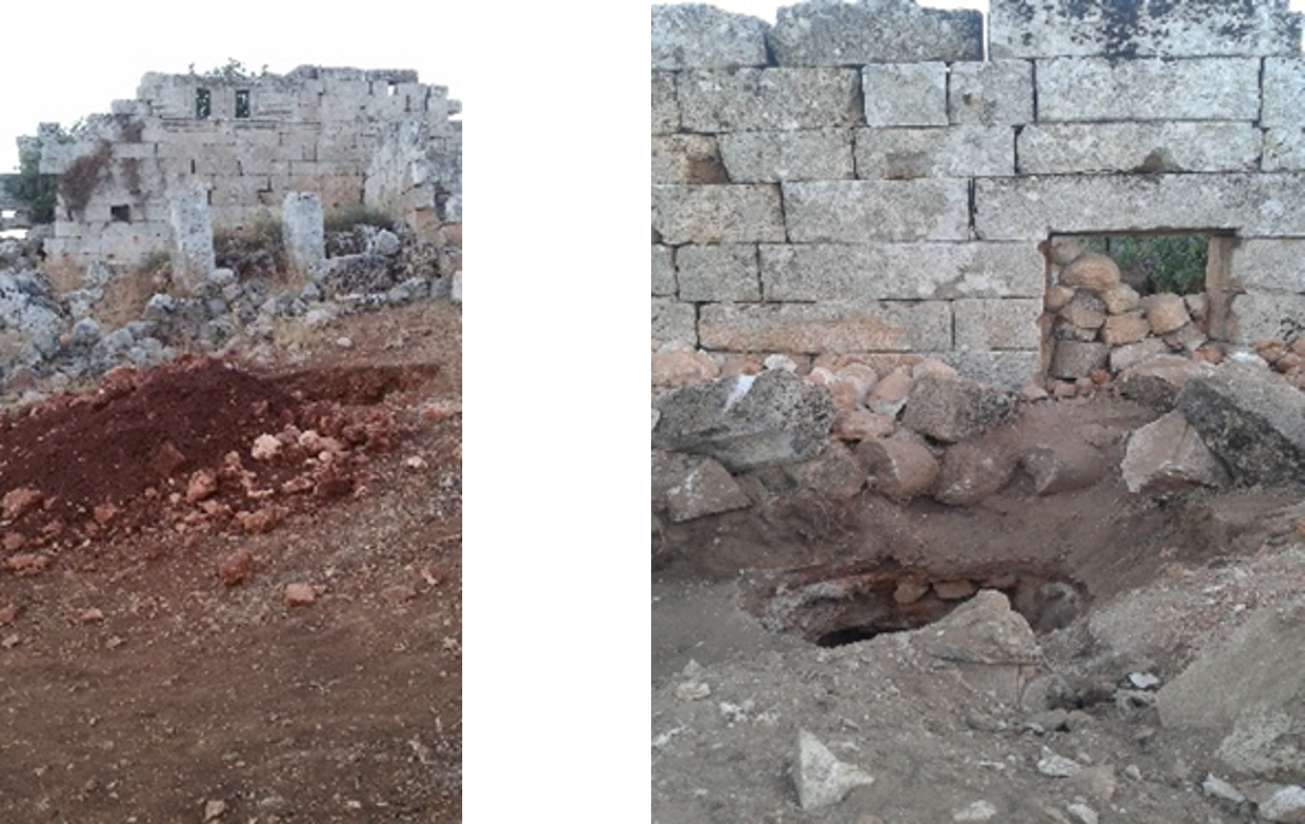 صورة رقم 22. حفر التنقيب السري تظهر بجوار أساسات البناء. ملكية الصورة: مركز آثار إدلب.