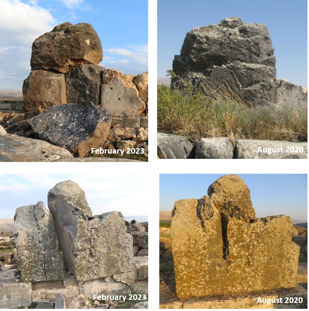 1_ إجراء مسح أولي للمواقع الأثرية في منطقة شمال غرب سورية من خلال زيارات ميدانية وتحديد المواقع المتضررة جراء الزلزال. لم تكن مهمة تحديد الضرر الناجم عن الزلزال سهلة لوجود أضرار عديدة في تلك المواقع ناجمة عن تعديات سابقة. لذلك اعتمدنا على معلومات السكان المحليين والنازحين القاطنين في المواقع الأثرية وجوارها، إضافة إلى تحليل الانهيارات في الجدران وملاحظة سطوح الأحجار المنهارة وتحديد تاريخ الانهيار من خلال طريقة تموضعها على طبقة التراب السطحية ساعد على ذلك أن الزلزال حدث خلال أيام ماطرة حيث انغمست الأحجار المنهارة حديثاً بطبقة من الوحل.