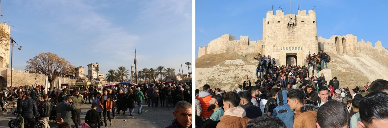 أما بالنسبة لقلعة حلب فهي لا تزال مغلقة من قبل إدارة العمليات العسكرية حتى تاريخ كتابة هذا التقرير ولا يسمح بزيارتها حتى من قبل العاملين في مديرية الآثار والكادر الإداري للقلعة. في حين أن ساحة القلعة ومحيطها أصبح مركزا رئيسياً لاحتفالات النصر بالحرية حيث يتوافد أهالي المدينة والمهجرين من المناطق الأخرى بشكل يومي لرؤية القلعة والاحتفال بمحيطها والتقاط صور تذكارية مع قلعتهم كرمز للنصر. (صورة 5)