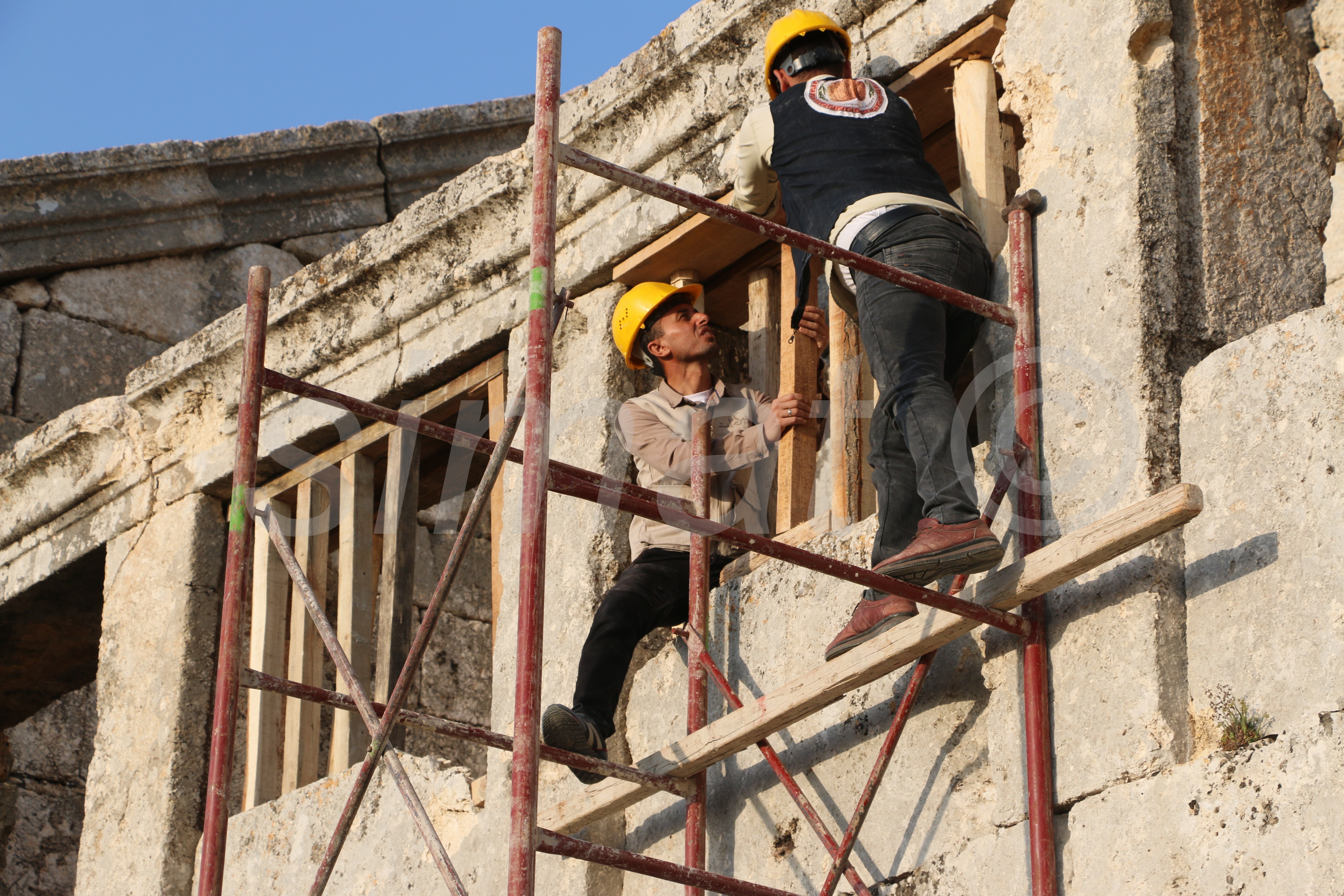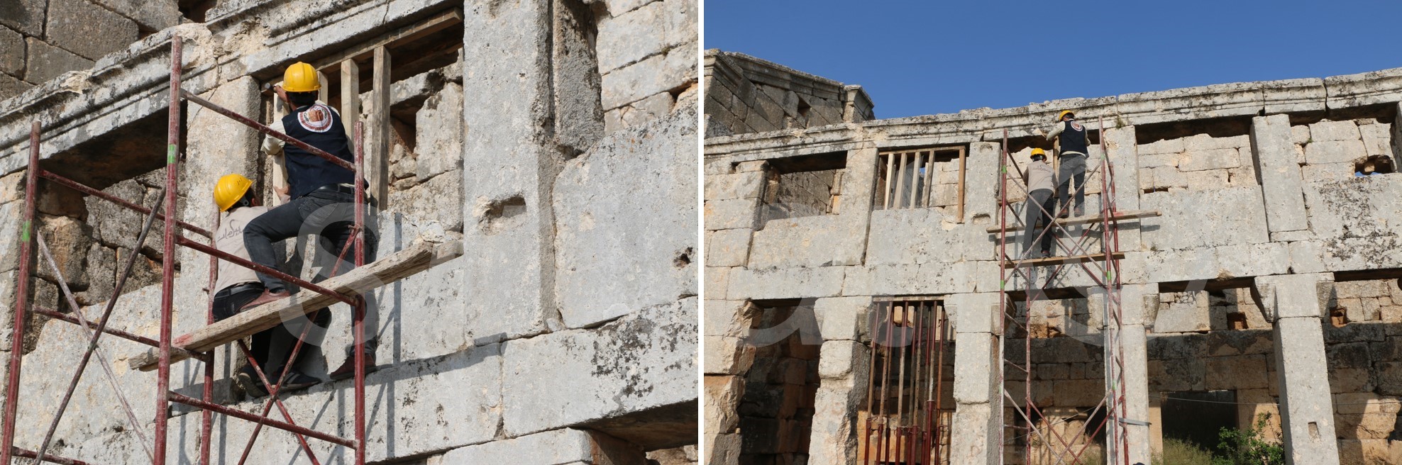 في منتصف شهر أيار عام 2023 بدأنا التدخل في قلعة سمعان لتثبيت الحالة الراهنة ومعالجة أضرار الزلزال ومنع إجراء تدخلات خاطئ في القلعة من خلال تقوية جدار الرواق الشرقي لمبنى الدير والتقليل من مخاوف الأشخاص المتواجدين في القلعة من خطر انهياره.