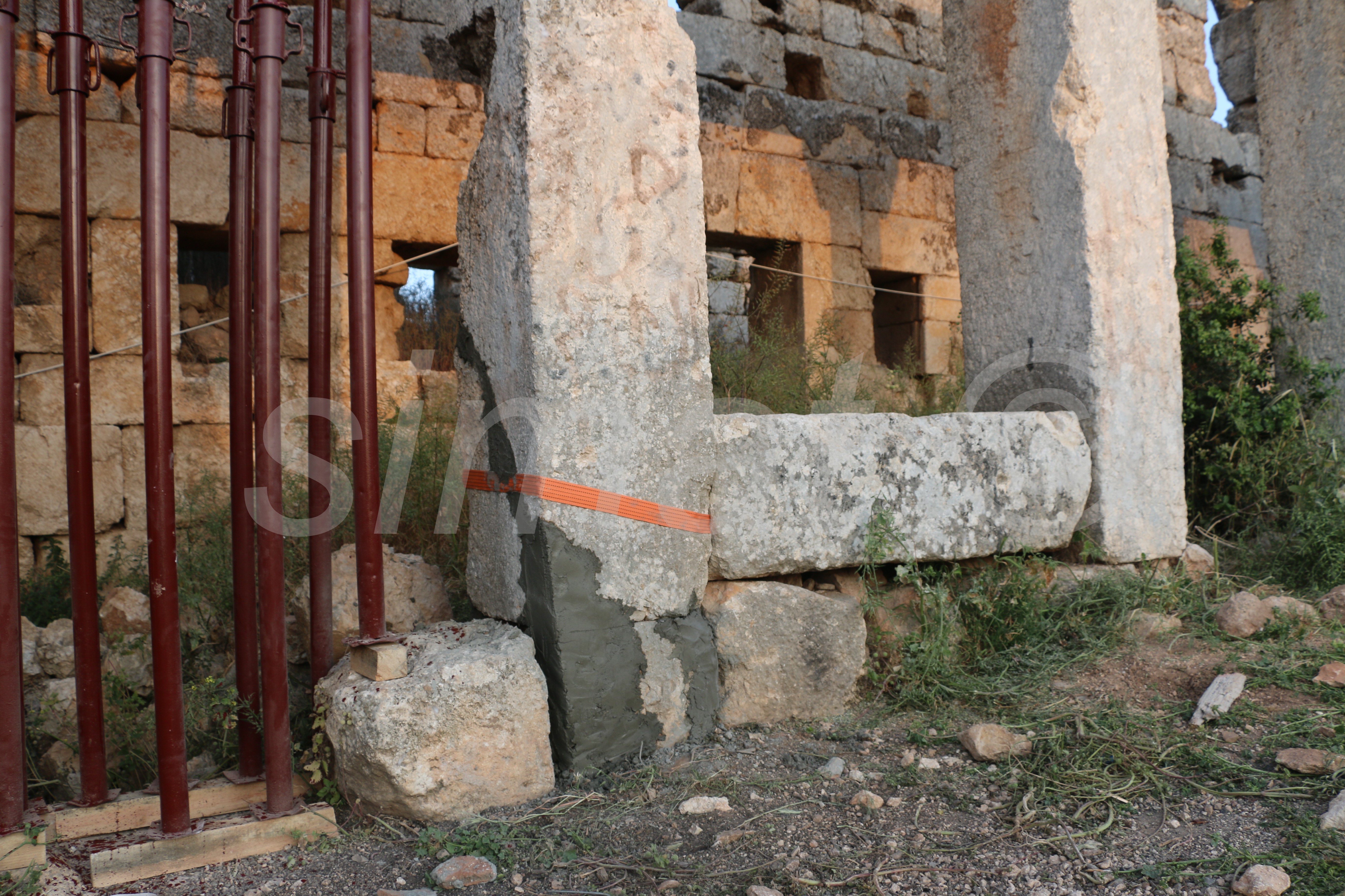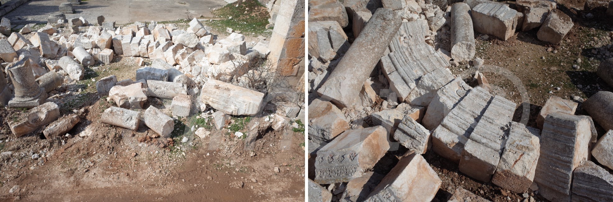 4_ إعادة تثبيت وربط الجزء المنهار من قاعدة الدعامة باستخدام مادة لاصقة وإعادة تكحيلها بالإسمنت. علماً أن هذا الجزء كان منفصل عن قاعدة الدعامة قديماً بشق مائل لكن خلال الزلزال انفصل بشكل كامل وسقط على الأرض.