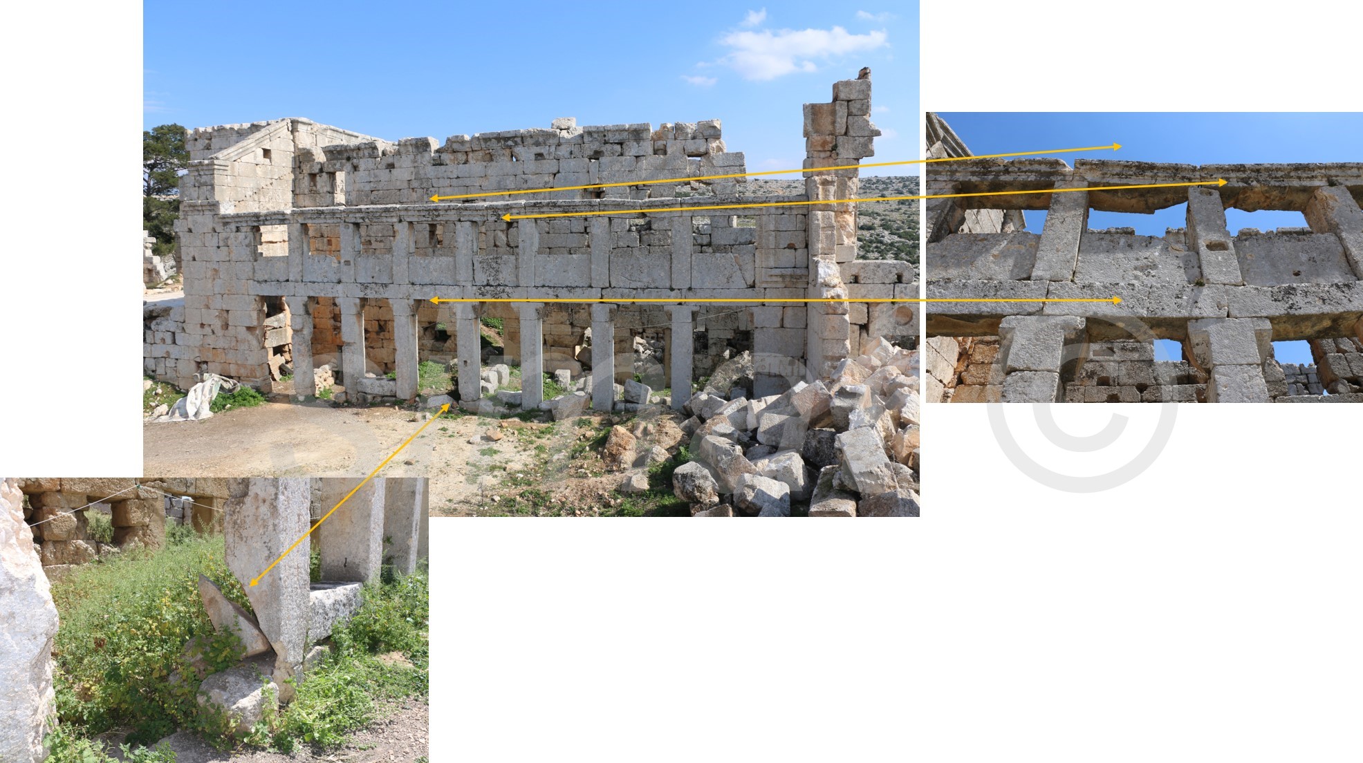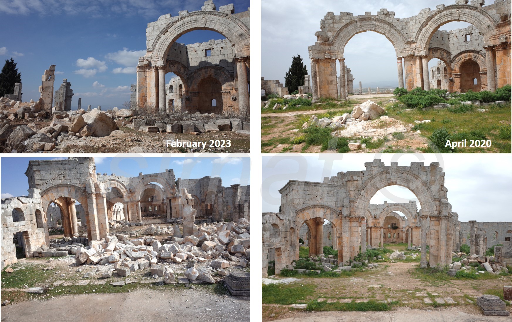 تعرضت قوس البازليك الغربية من المثمن الذي يحيط بعمود القديس سمعان لأضرار سابقة نتيجة القصف الجوي عام 2016 الأمر الذي أضعف من ثباته. لذلك أجرينا عملية تدخل إسعافي لتقوية القوس لمقاومة العوامل الجوية والاهتزازات الخفيفة الناجمة عن أعمال قصف محتملة. لكن شدة الزلزال كنت أكبر من قدرة القوس على المقاومة فانهارت الأعمدة والقوس باتجاه الغرب وسقط على شكل كتلة واحدة.