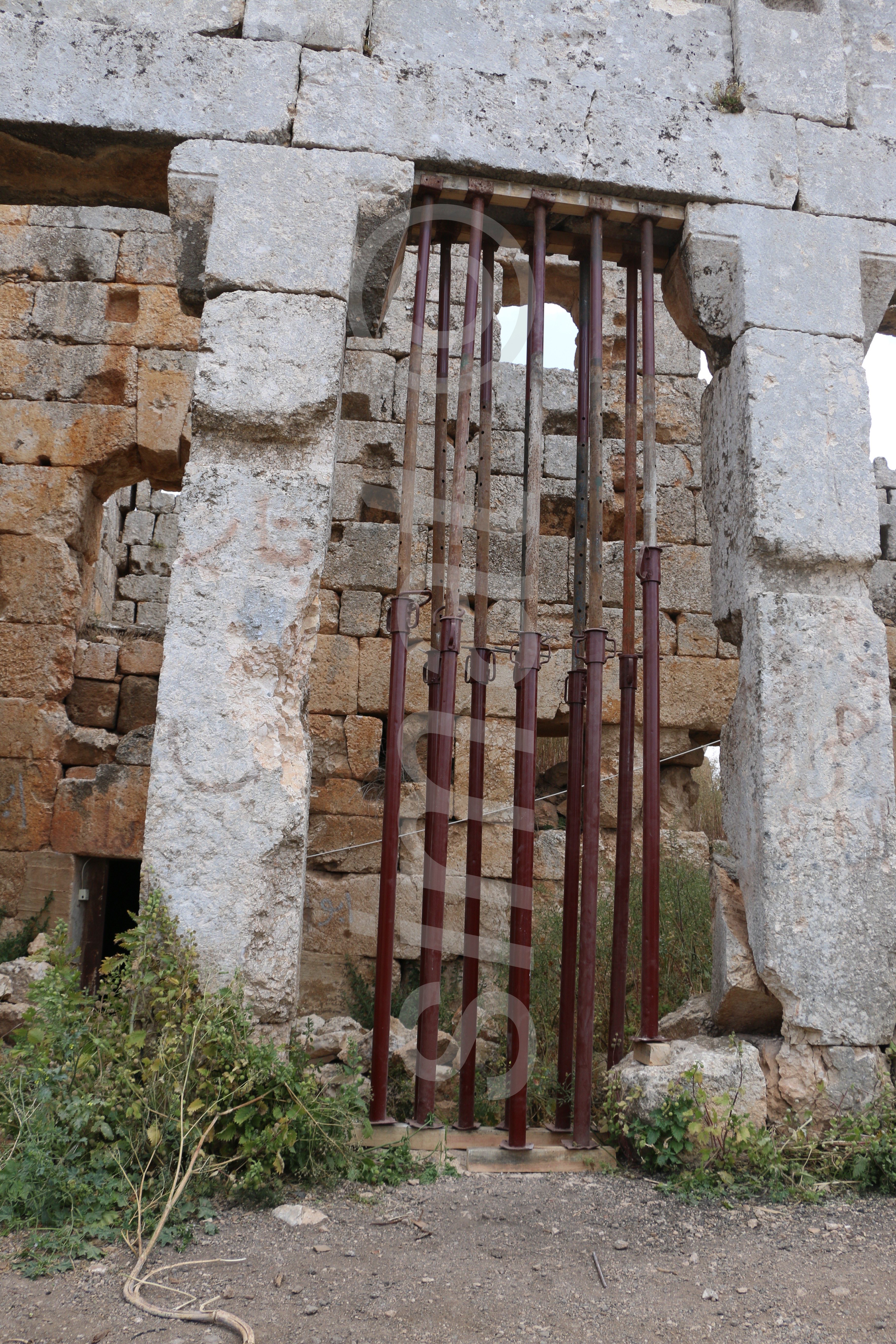 1_ تدعيم الساكف المتضرر بأعمدة حديدية مزودة بعوارض خشبية تفصل بين الحديد والحجر الأثري وتؤمن مرونة في حالات التمدد والتقلص نتيجة العوامل الجوية.