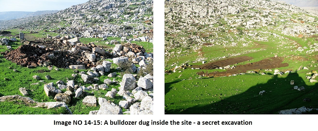 Tillage processes are underway around the site in order to plant olive trees. These fields are mainly of irregular shapes, they are defined by the available area of land. Expansion are made later by dismantling the archaeological walls and removing their debris. This violation is new, it started around the current agricultural season as the farmers were seeking to gain the most possible area of land to plant.