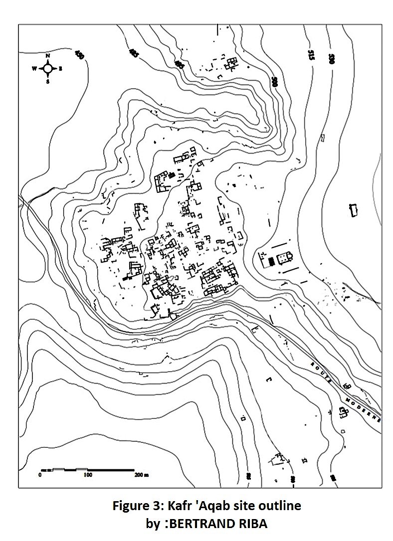 It is a small site in the Lime Massif, and it date back to the Roman-Byzantine era. It is located to the west of Al-Fasouq village in a rugged mountainous region. The site is isolated, it can only be reached on foot. The site sits on the edge of a rocky cliff and it looks up on a valley surrounded by abrupt rocky slopes of a poor greenery.. Figure (5)