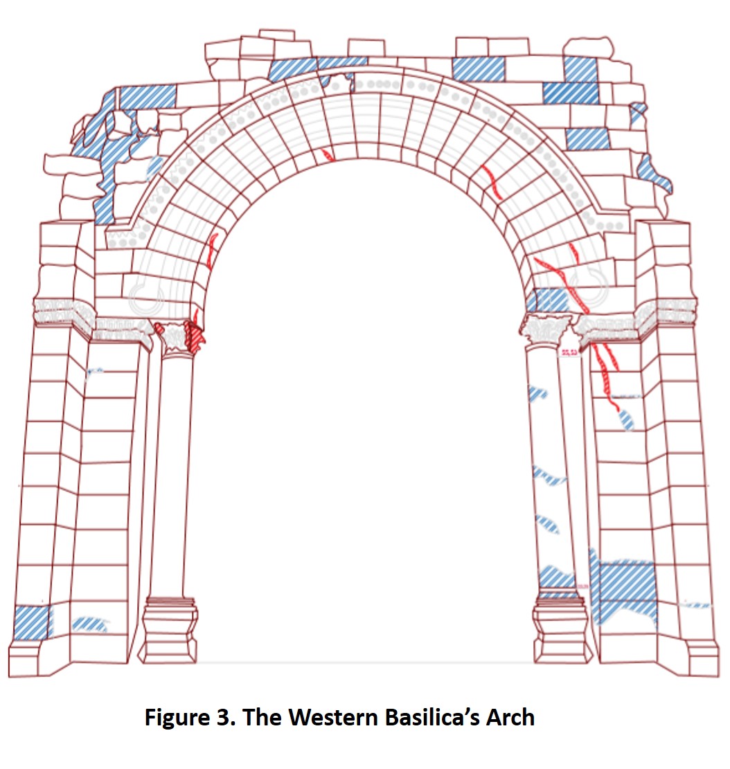 It is feared that the crown of the northern column is too weak to endure the impact of weathering. In case of collapsing other parts of the crown, the arch will be prone to collapsing, especially, with the existing cracks in the blocks of the arch and the adjacent buttresses, and the continuation of the military operations around the site.