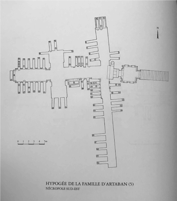 It is a family tomb, like many tombs in Palmyra, that was established by Artaban as an underground tomb for him and his family. It can be accessed from the outside via a staircase that leads to a door. After entering the door, the tomb becomes divided into three sections: two passages, one on the right side and another on the left that contain several graves. There is a third passage on the axis of the door, which leads to a hall. In the middle of this third passage and on both of its sides, there are two halls of quadrilateral floorplans, which were burial chambers as well.