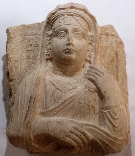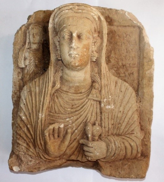 [7] References: Anna Sadurska and Adnan Bounni, Les sculptures funéraires de Palmyre (Rome, 1994) 32, cat. 31, fig. 13; Maura Heyn, “Gesture and Identity in the Funerary Art of Palmyra”, American Journal of Archeology 114 (2010), 631–661, esp. 644, appendix 1, cat. 10, 650, appendix 4, cat. 35; Signe Krag and Rubina Raja, “Representations of Women and Children in Palmyrene Funerary Loculus Reliefs, Loculus Stelae and Wall Paintings”, Zeitschrift für Orient-Archäologie 9 (2016), 134-178, esp. 159 n. 15, 159 n. 19, 159 n. 32, 159 n. 36, n. 40, 36 nn. 42-43, 36 n. 45, 36 nn. 52-54, 36 n. 59, cat. 2; Dagmara Wielgosz-Rondolino, “Orient et Occident unis par enchantement dans la pierre sculptée. La sculpture figurative de Palmyre”, in Michel Al-Maqdissi and Eva Ishaq (eds.), La Syrie et le désastre archéologique du Proche-Orient, “Palmyre cite martyre” (Beirut, 2016), 66-82, esp. 70–71, fig. 5; Signe Krag, Funerary Representations of Palmyrene Women. From the First Century BC to the Third Century AD (Turnhout 2018),