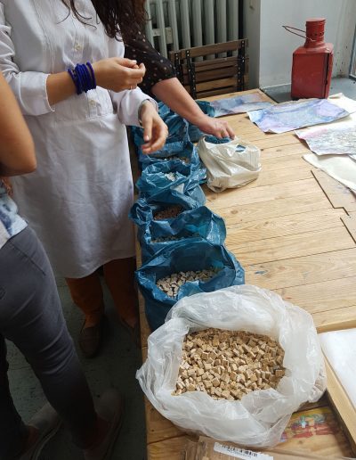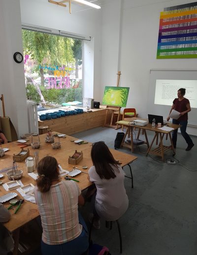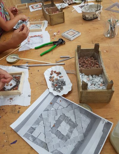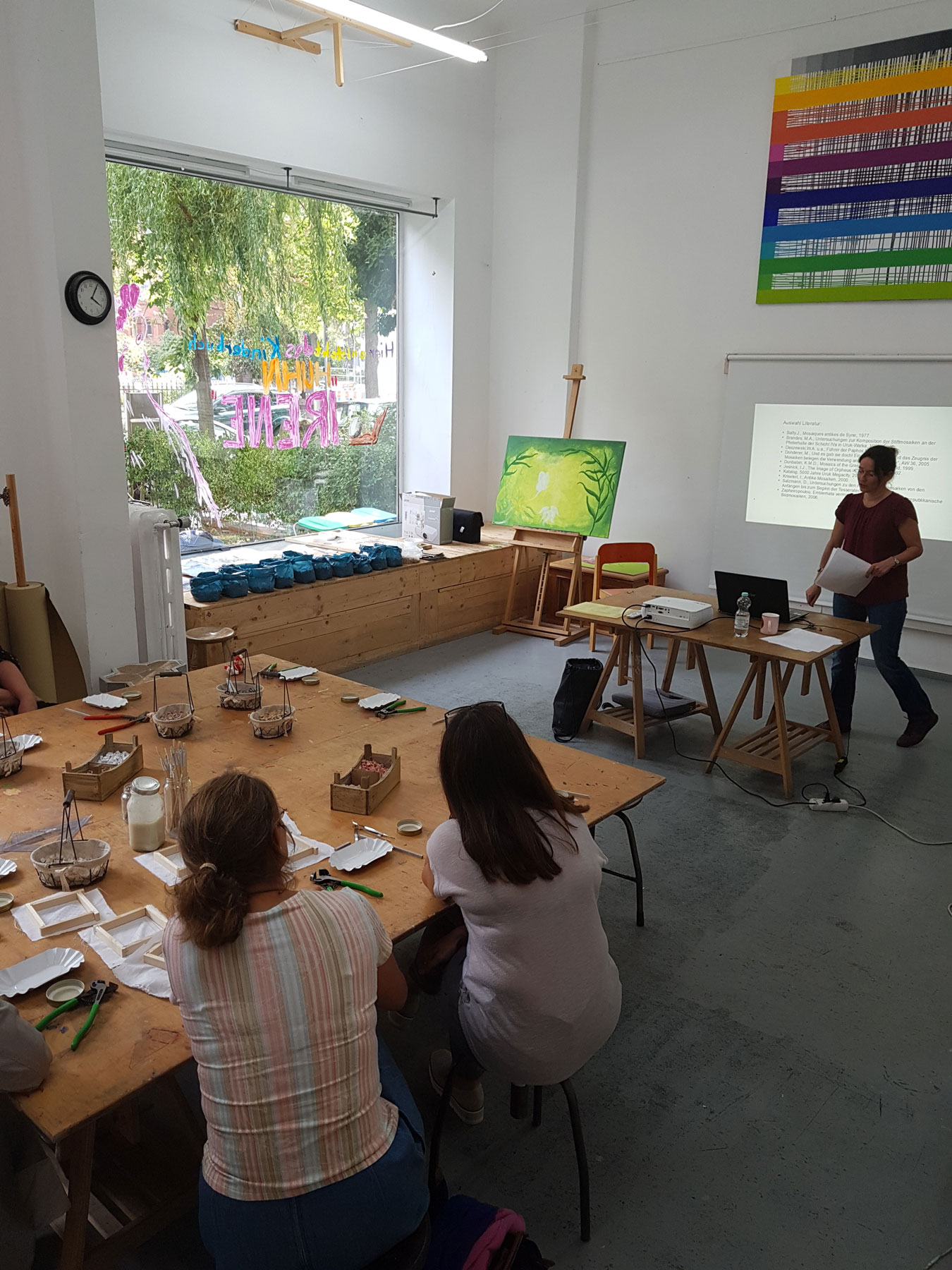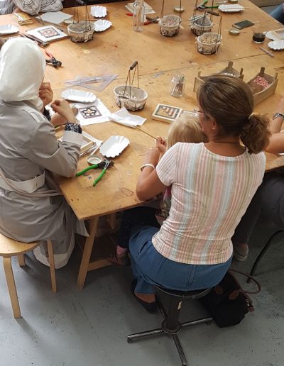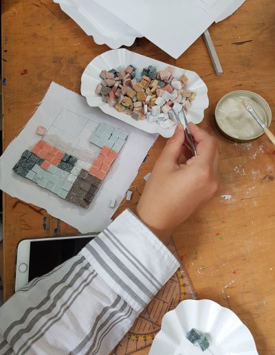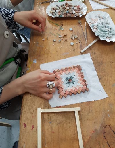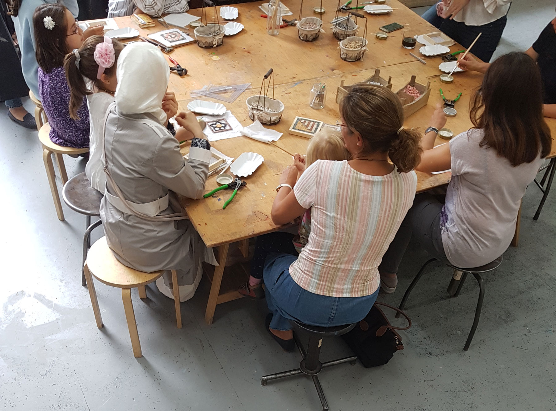 The basics of manufacturing a mosaic piece is the same across the world, however, each country enjoys specific details and methods that do not share with others. The ongoing war in Syria imposes today a threat to the local handcrafts including mosaic. But thanks to one Syrian artist, Khawla Zakaria, SIMAT has been able to contribute to safeguarding this art by offering workshops In Berlin on mosaic art that raise awareness of the Syrian and German community on the importance of this art. Every participant in the workshop receives an introduction to mosaic art and its history in Syria, in addition to learning and practicing Syrian traditional techniques in making it. Moreover, SIMAT’s team has developed a presentation on mosaic art in general, and in Syria in specific. It is also planned to host artist Sonia Tawal from Jordan who will give a public lecture on mosaic art.
